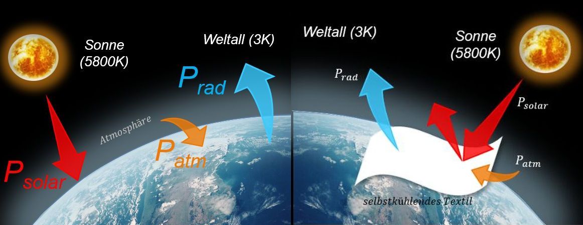 Um dieses Prinzip zu nutzen, wurde an den DITF eine ressourcenschonende Beschichtungsrezeptur für technische Textilien entwickelt, die zwei besondere Eigenschaften besitzt: Zum einen reflektiert diese Beschichtung das Sonnenlicht mit hoher Effizienz und vermeidet damit, dass das Textil Energie aufnimmt und sich dabei aufheizt. Gleichzeitig besitzt diese Beschichtung eine hohe Abstrahlwirkung im mittleren Infrarotbereich. Dadurch strahlt die Wärmeenergie des beschichteten Textils an das kalte Weltall ab und das Textil kühlt sich ab. Diese beiden Eigenschaften sorgen dafür, dass sich die Beschichtung nicht aufheizt, sondern sogar kühlt
