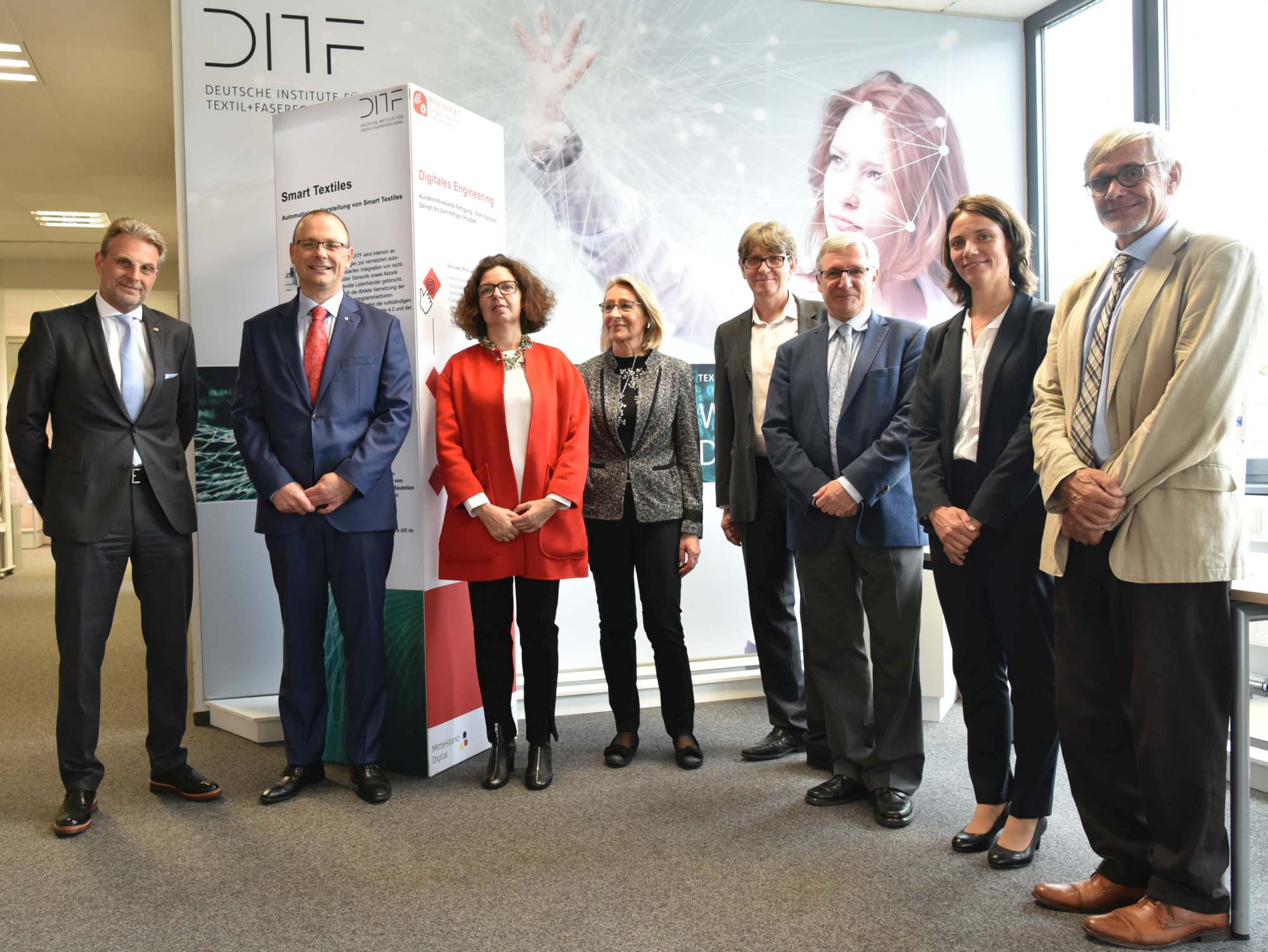 Die französische Generalkonsulin Catherine Veber, zuständig für Baden-Württemberg, wird den Ausbau der Kooperation mit Frankreich im politischen und administrativen Bereich unterstützen. Sie besuchte am 26. September 2019 die DITF und informierte sich über aktuelle Forschungsprojekte und deren weitgefächerte Anwendungsbereiche. Dadurch sind die DITF nicht nur Forschungspartner für die klassische Textilindustrie, sondern auch für Unternehmen in den Bereichen Hochleistungsfasern, Architektur, Fahrzeugbau, Energie- und Umwelttechnik oder Medizin.