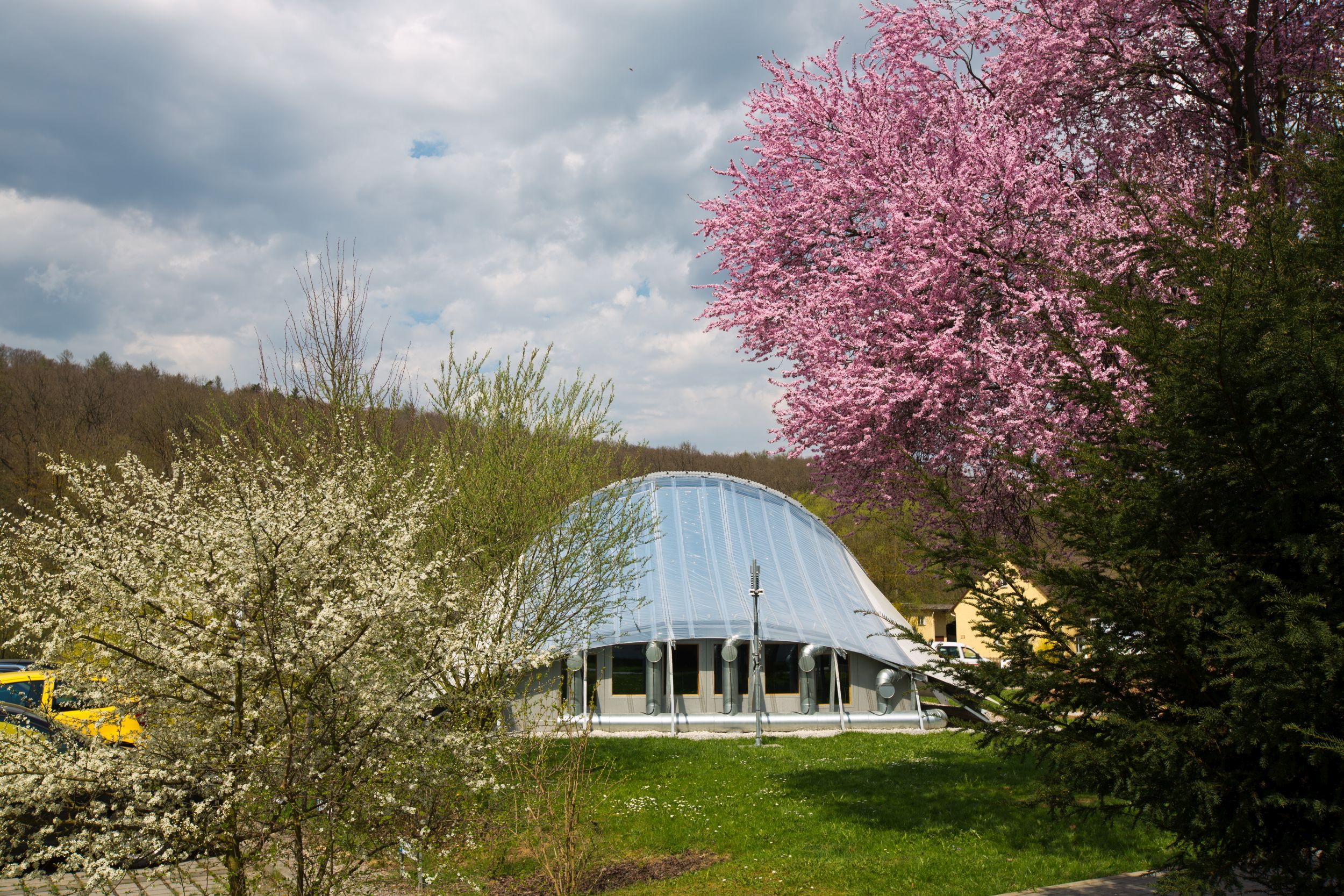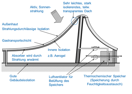 Neu ist auch das Langzeit-Wärmeenergiespeichersystem des Gebäudes. Der Energiespeicher kann Wärmeenergie in physikalisch-chemische Energie umsetzen und nahezu verlustfrei speichern. Die patentierte Entwicklung kann den Tag/Nacht-Temperaturwechsel ausgleichen und im Sommer ausreichend Wärme speichern, um den Pavillon im Winter zu beheizen. Das Speichermedium besteht aus Silikagel, das viel Feuchtigkeit aus der Umgebung bindet. Viele kennen diese Kügelchen, die in kleine Papiertütchen oder Kissen gefüllt feuchtigkeitsempfindlichen Waren beigelegt werden. Beim Trocknen nimmt das Gel Wärme auf, die es wieder abgibt, sobald es befeuchtet wird. Bei der Befeuchtung entsteht eine Temperaturerhöhung der Luft um ca. 25°C, die für die Beheizung über einen Wärmetauscher benutzt wird. Das Granulat kann problemlos 2.000 Be- und Entladezyklen bewältigen.