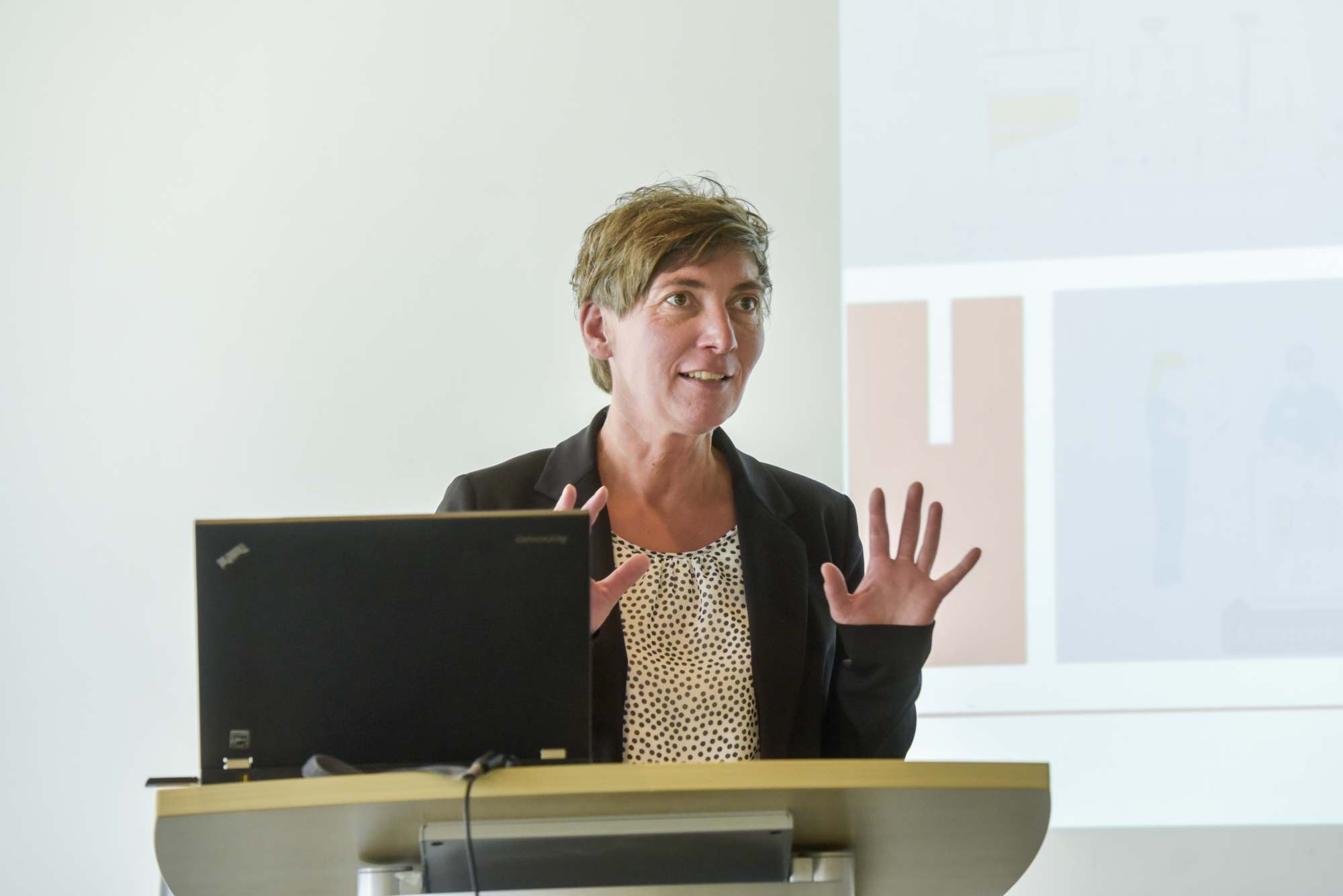 Professor Götz T. Gresser, Sprecher des Vorstands der Deutschen Institute für Textile und Faserforschung (DITF), begrüßte herzlich die Gäste aus Forschung, Politik und Wirtschaft. Die stellvertretende Leiterin des Referats Mittelstand Digital beim Bundesministerium für Wirtschaft und Energie, Juliette Melzow, erklärte, dass Deutschland weltweit im Bereich der Digitalisierung nur im Mittelfeld rangiere und die Lücke zwischen kleinen und großen Unternehmen noch groß sei. Die Förderinitiative sei deshalb als „Brücke zwischen neuen Technologien und Unternehmensbedürfnissen“ gedacht. Das DITF-Schaufenster helfe, kleine und mittelständische Unternehmen mit guten Beispielen aus der Praxis zu überzeugen.