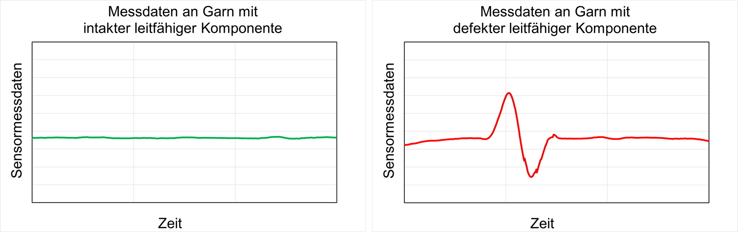 Die Garne werden also sowohl bei der Umwindegarnherstellung als auch im anschließenden Strickprozess überwacht. Tritt ein Bruch der leitfähigen Garnkomponente auf, wird er sofort entdeckt. Luftfeuchtigkeit und Umgebungstemperatur beeinträchtigen die Messgenauigkeit nicht. Die Überwachung der Prozesse funktioniert nicht nur bei Gestricken, sondern auch bei anderen textilen Flächen.