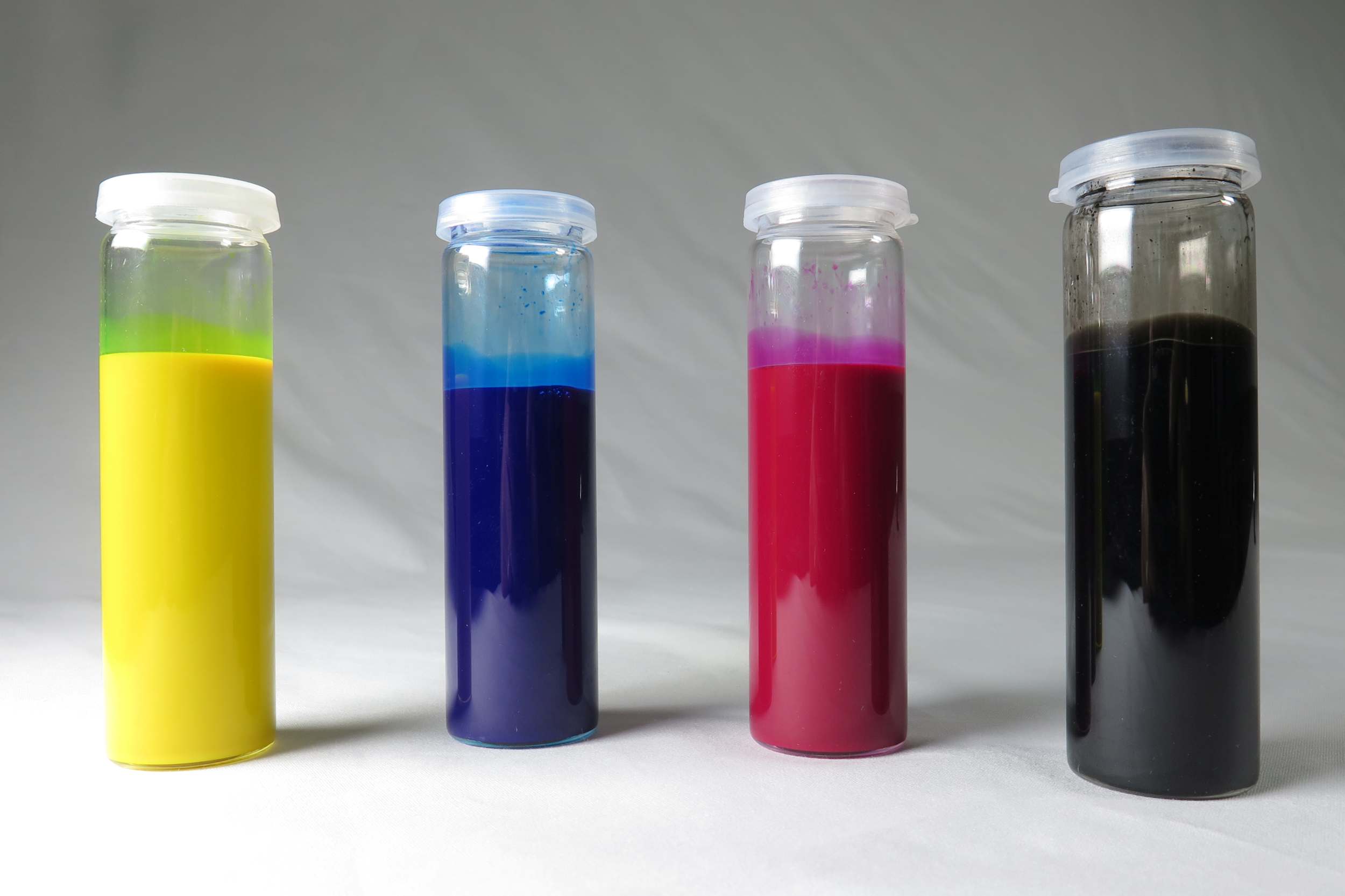 Die innerhalb des Forschungsprojektes eingesetzten Pigmenttinten sind eine Eigenentwicklung der DITF: Aus organischen Farbpigmenten werden feinteilige Pigmentdispersionen hergestellt. Die Zugabe von Bindemitteln ermöglicht eine gute Haftung der Pigmente auf dem textilen Substrat. Und über die Beimischung von Additiven lassen sich weitere Eigenschaften der Pigmenttinten wie deren hygroskopische oder rheologische Merkmale beeinflussen.