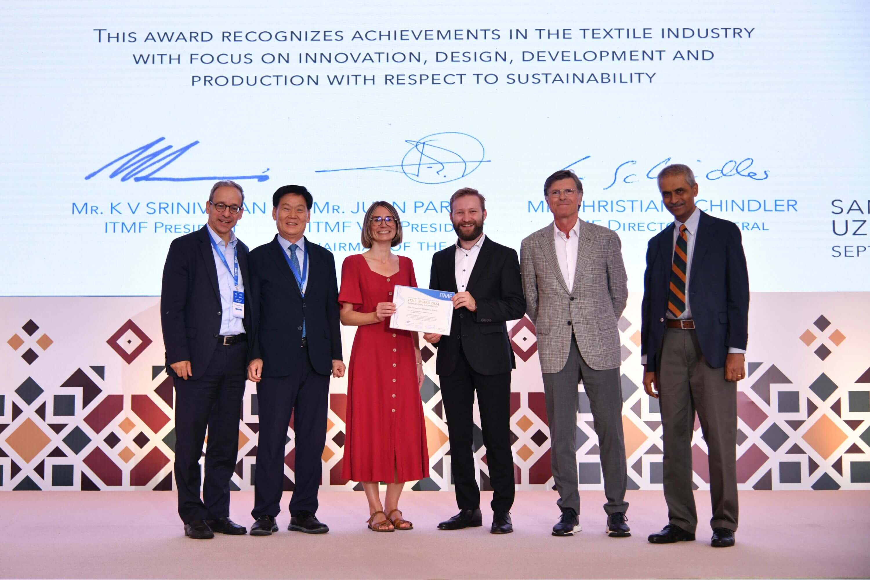 Mit diesem Leitgedanken konnten sich die beiden Partner in Samarkand, Usbekistan, erfolgreich auf der ITMF [&] IAF Conference 2024 präsentieren. Gemeinsam stellten sie dem Fachpublikum und der Jury eine vollständige textile Herstellungskette vor – vom Rohmaterial über dessen Aufbereitung, der Spinntechnologie und der Verwirklichung textiler Produkte.