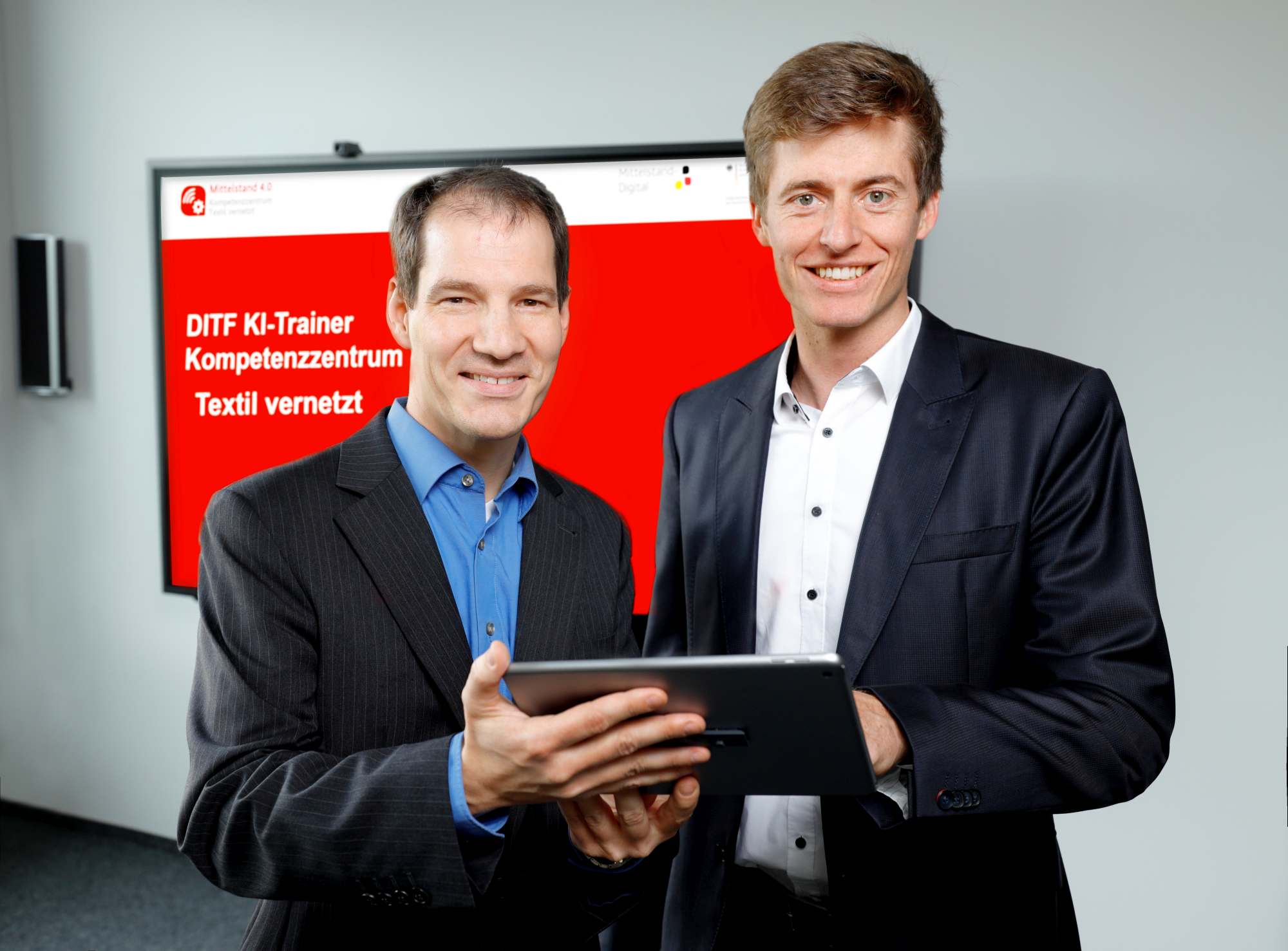 Dr. Heiko Matheis und Sebastian Micus von den DITF gehen seit September als „KI Trainer“ in kleine und mittlere Unternehmen. Sie zeigen, welche Möglichkeiten künstliche Intelligenz der Textil- und Bekleidungsbranche bietet. Die DITF sind Partner im Mittelstand 4.0 Kompetenzzentrum Textil vernetzt, das zukünftig vier KI Trainer in Unternehmen schickt.