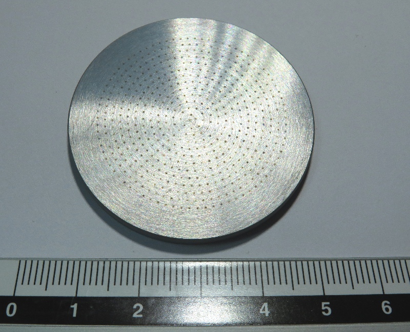 In grellgrünem Laserlicht erstrahlt eine rund vier Millimeter dicke Scheibe aus Edelstahl. Mit hoher Energie bohrt sich der ultrakurz gepulste Laserstrahl in die Oberfläche des Metalls, immer wieder, bis eine Vielzahl von Löchern entstanden ist.