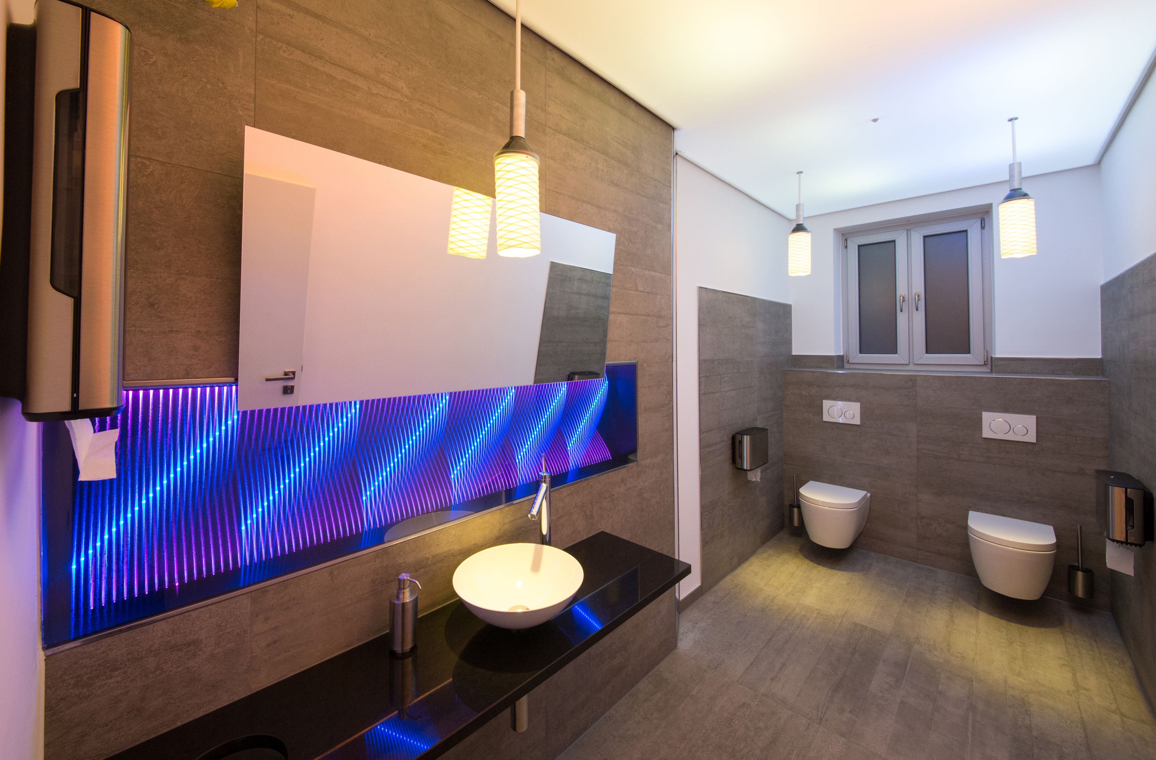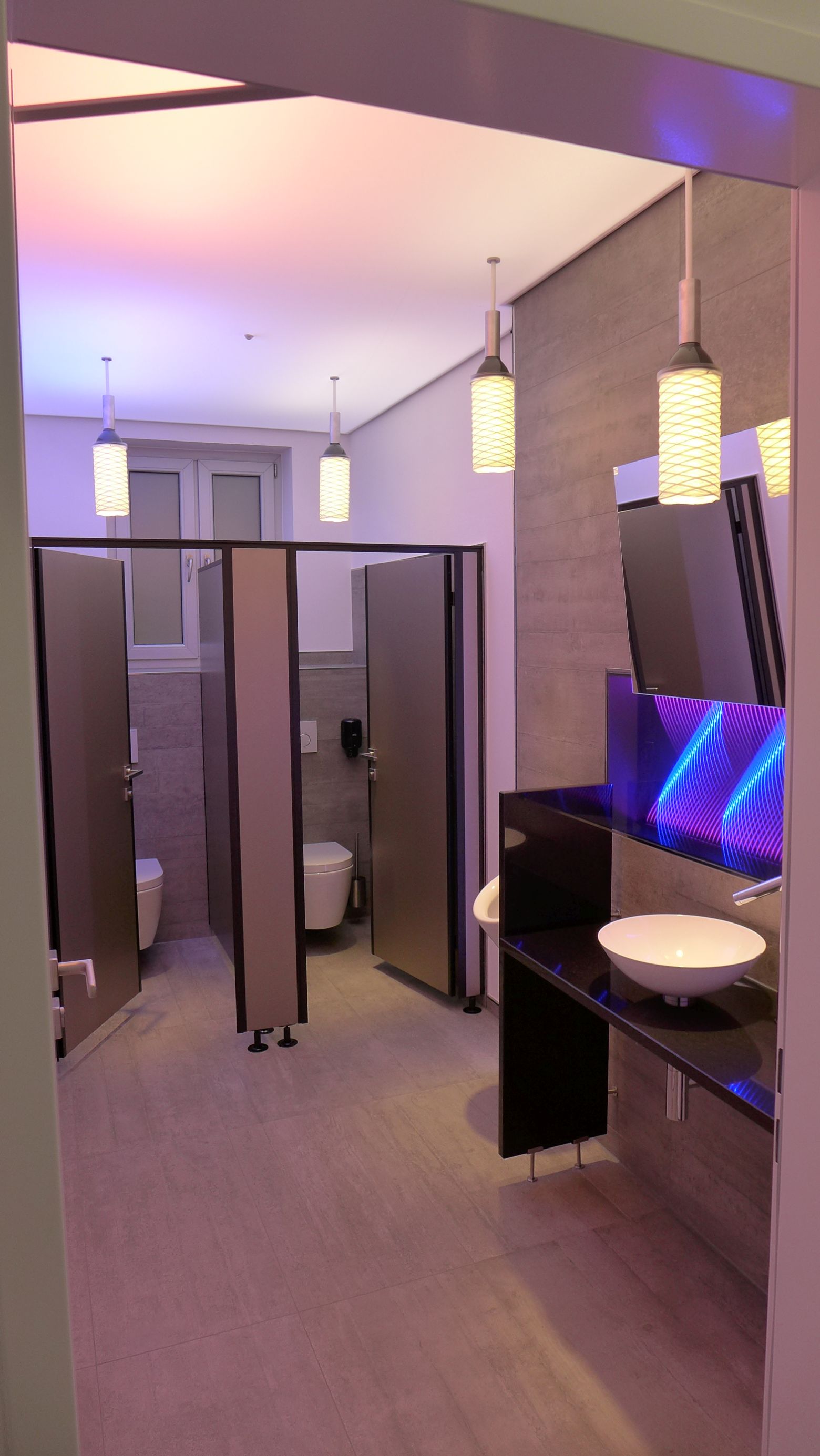 Das textile Beleuchtungskonzept zeigt beispielhaft, wie man modern e Anforderungen an öffentliche Toiletten ohne große bauliche Veränderungen erfüllen kann. Nach einer simulationsgestützten Lichtplanung entstand mit einer textilen Lichtdecke, dem gerichteten Licht von strukturgespulten Lampen und der Ambiente-Beleuchtung des ETTLIN LUX®-Smartglass auch in engen und dunklen Toiletten eine gepflegte und angenehme Atmosphäre.
