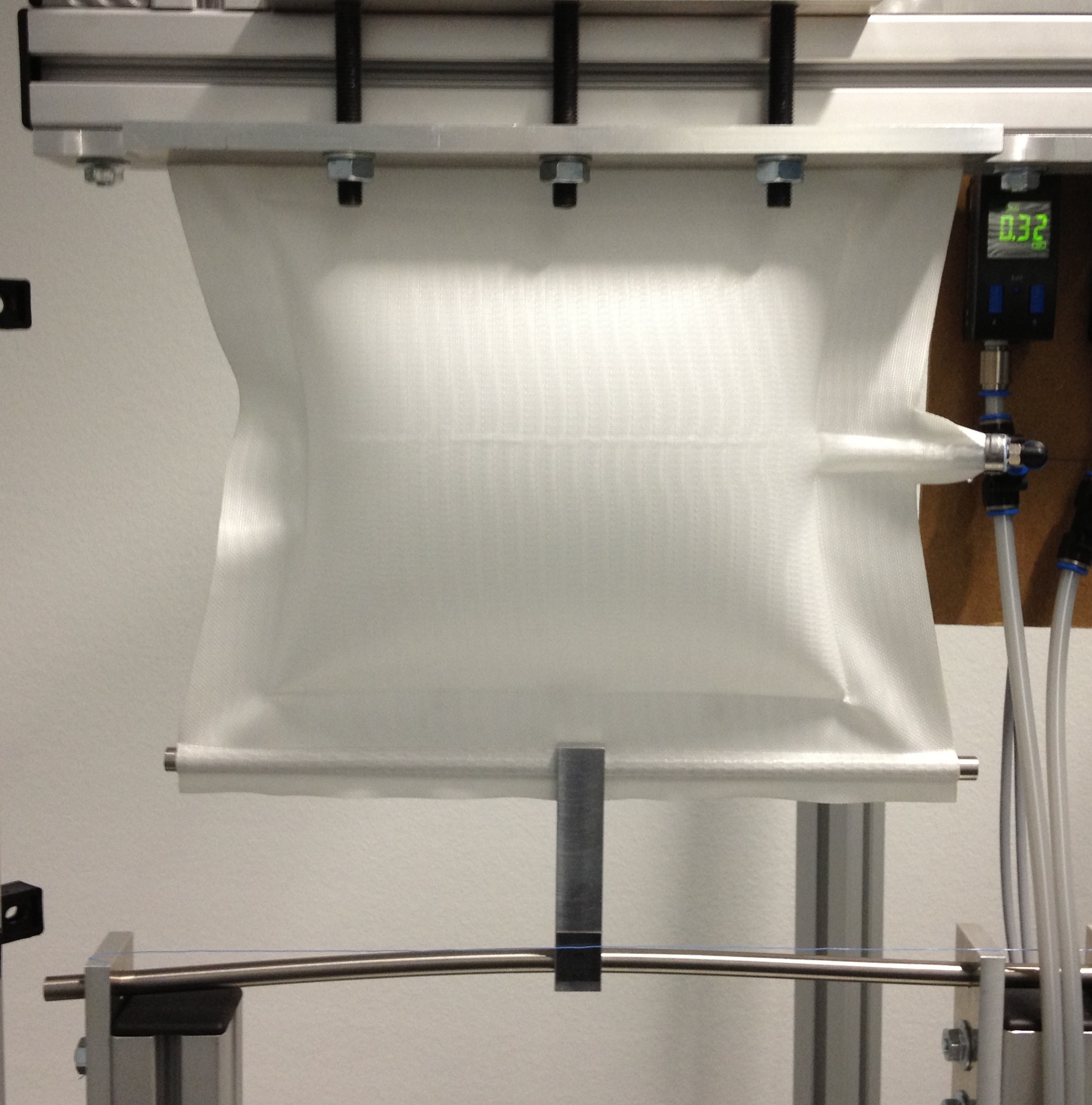 Auch Kräfte können auf diese Weise realisiert werden. Durch Aufblasen einer nur 20x20 cm großen Kammer mit einem Druck von unter 0,5 bar kann eine massive Edelstahlstange problemlos verbogen werden (Bild 3).