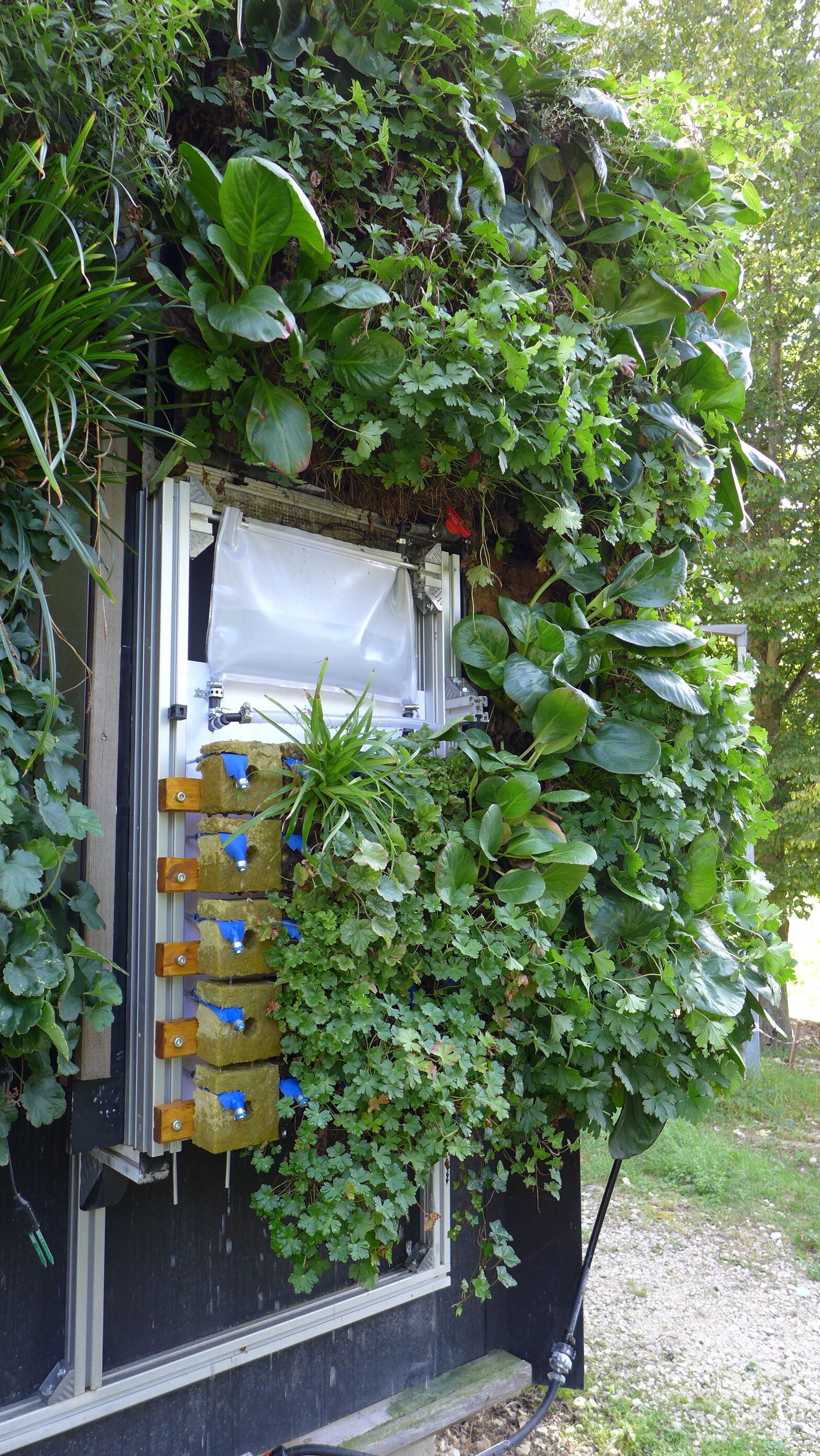 Die Pflanzen auf den grünen Fassaden werden über ein automatisches Bewässerungssystem mit Wasser und Nährstoffen versorgt. Die „Living Walls“ arbeiten weitgehend autonom. Sensorische Garne erfassen den Wasser- und Nährstoffgehalt. Der Aufwand für Pflege und Wartung ist gering.