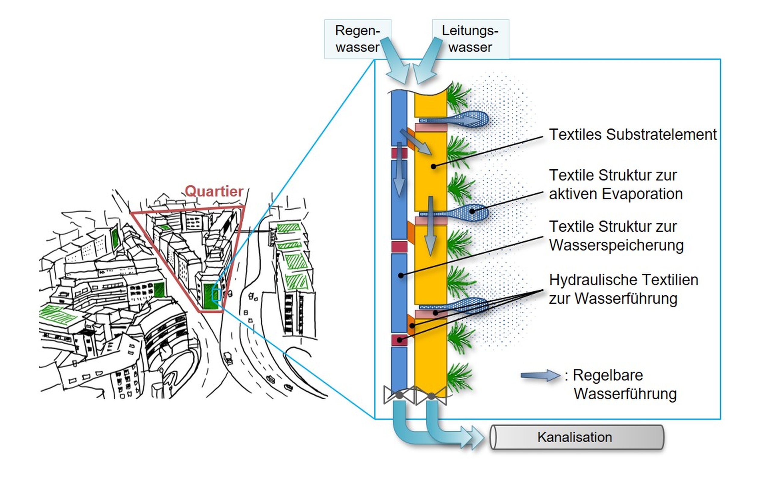 Über neuartige hydraulische Textilstrukturen wird die Wasserführung geregelt. Das Pflanzsubstrat aus Steinwolleauf dem die Pflanzen wachsen, verfügt durch seine Struktur über ein großes Volumen auf engem Raum. Je nachdem, wie stark die Niederschläge sind, wird das Regenwasser in einer textilen Struktur gespeichert und später zur Bewässerung der Pflanzen genutzt. Bei Starkregen wird das überschüssige Wasser mit zeitlicher Verzögerung in die Kanalisation eingeleitet. Die an den DITF entwickelten „Living Walls“ helfen auf diese Weise, in nachverdichteten Ballungsräumen die Ressource Wasser effizient zu nutzen.