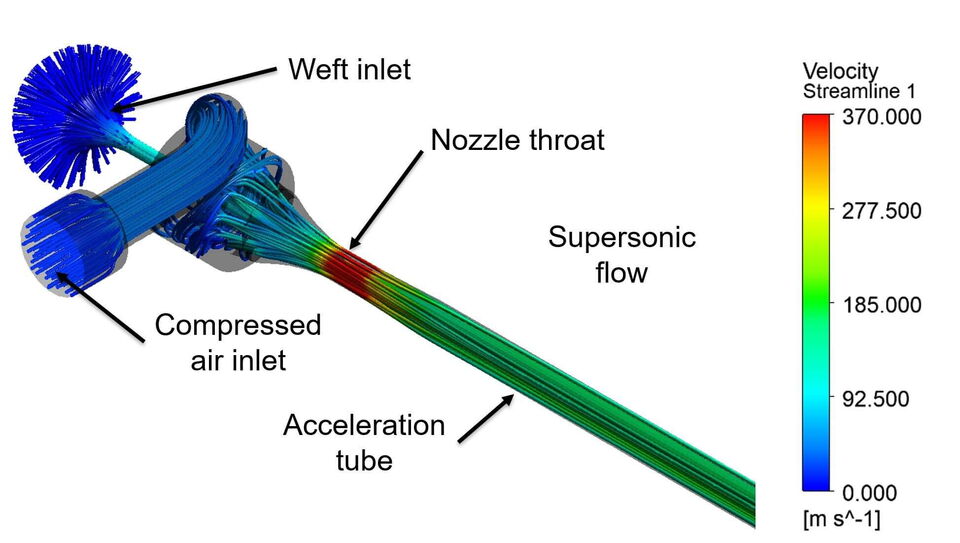 Luftströmungen innerhalb einer Hauptdüse der Luftdüsenwebmaschine -