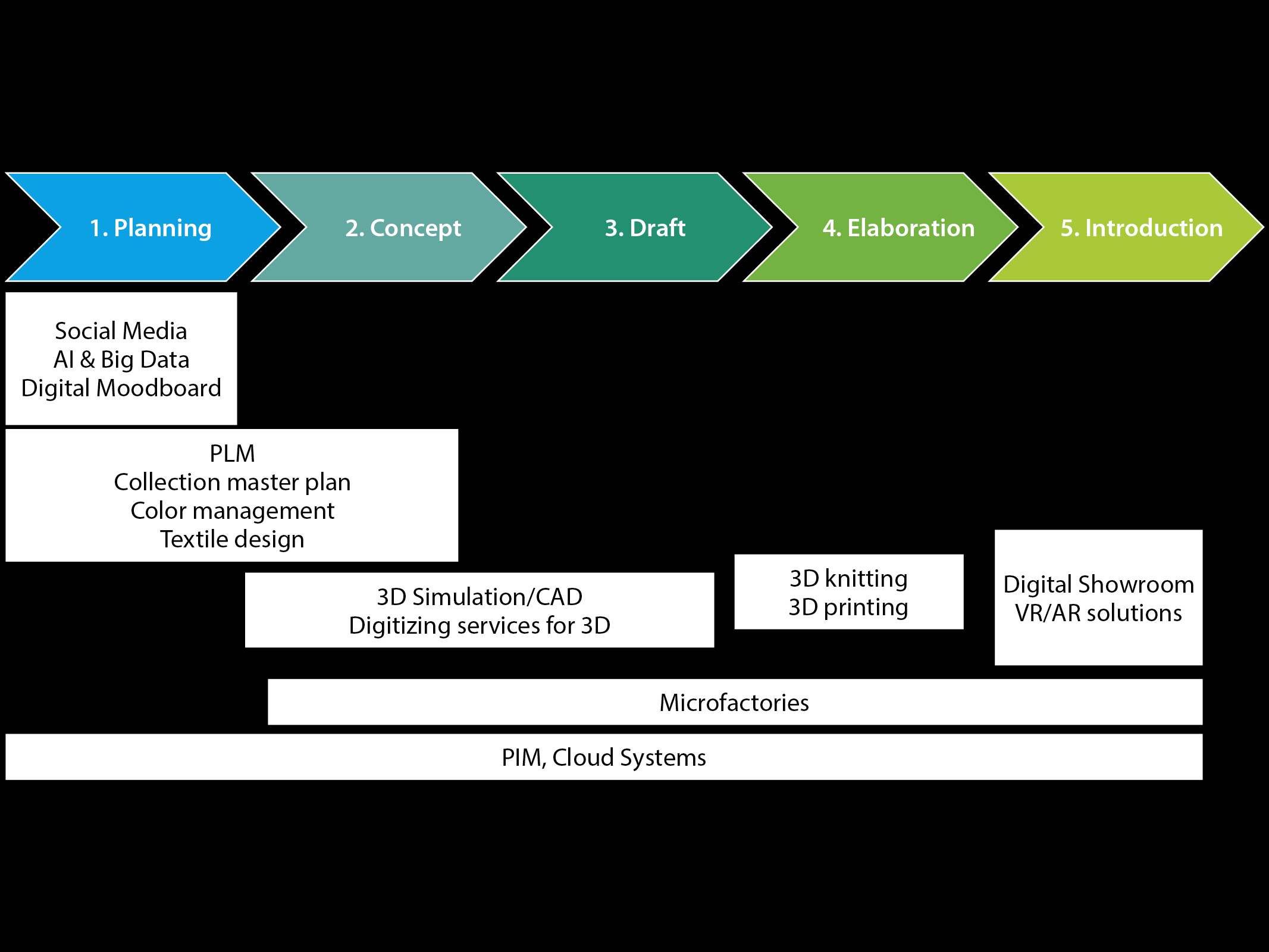 The procedure was tested on the basis of case studies from various members of the project advisory committee who are active in different product groups (accessories, sportswear, wor wear and children's clothing). Here, individual potential analyses were carried out taking into account a parameterizable model for calculating material, personnel and environmental costs (MFCA – Material Flow Cost Accounting). Individual phases along the collection development process and existing velopment”, it was shown how apparel companies can tackle these challenges with manageable effort and realize digitization with the help of a successive transformation. The procedure was tested on the basis of case studies from various members of the project advisory committee who are active in different product groups (accessories, sportswear, workwear and children's clothing). Here, individual potential analyses were carried out taking into account a parameterizable model for calculating material, personnel and environmental costs (MFCA – Material Flow Cost Accounting). Individual phases along the collection development process and existing tools were analyzed, and suitable