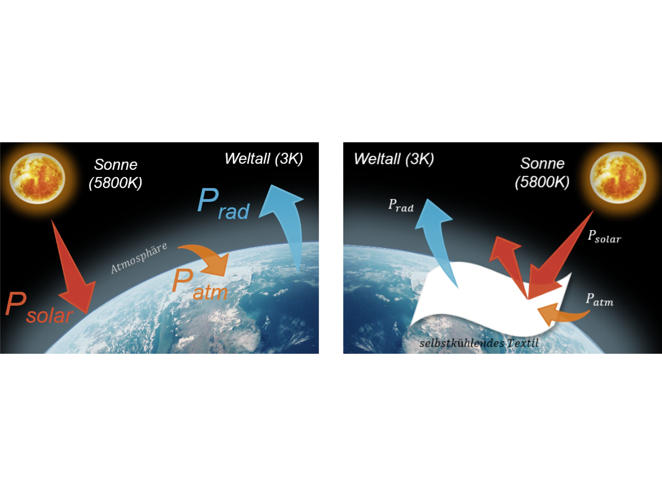 Indem die terrestrische Oberfläche Wärme nicht an die direkte Umgebung, sondern durch die Atmosphäre hindurch an das Universum mit extrem niedrigen Temperaturen (ca. –270 °C) abgibt, entsteht eine Kühlung unter Umgebungstemperatur. Sendet ein Material im mittleren Infrarotbereich (bevorzugt zwischen 8-13 μm) mehr Strahlung aus, als es durch die Sonne und die Atmosphäre aufnimmt, erfolgt eine Kühlung auch am Tag unter voller Sonneneinstrahlung.