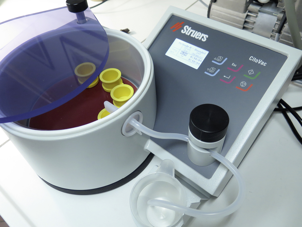Mit dem Erwerb eines Strues CitoVac Vakuumeinbettgerätes, ermöglicht durch den Verein der Förderer der DITF, erschließen sich für die DITF neue Möglichkeiten für die mikroskopische Präparation textiler Materialien. Mit Hilfe des Einbettgerätes können Proben mit großer Oberfläche oder porösen Strukturen blasenfrei in Epoxid- oder Acrylharzen eingebettet werden.