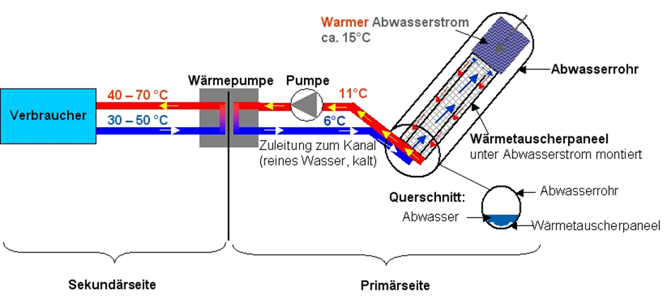 Das Wärmetauscherpaneel wird in den Solebereich des Abwasserkanals eingebracht (siehe Abb. Primärseite). Das Abwasser besitzt im Jahresdurchschnitt eine Temperatur von ca. 8 - 15°C. Zwischen dem Abwasser und den Fluiden im Wärmetauscherpaneel findet der Wärmeaustausch statt. Das Fluid im WTP erwärmt sich und wird der Wärmepumpe zugeführt. Von der Wärmepumpe wird die Temperatur auf ein höheres Niveau von ca. 40-70°C angehoben und zu Heizzwecken bereitgestellt.