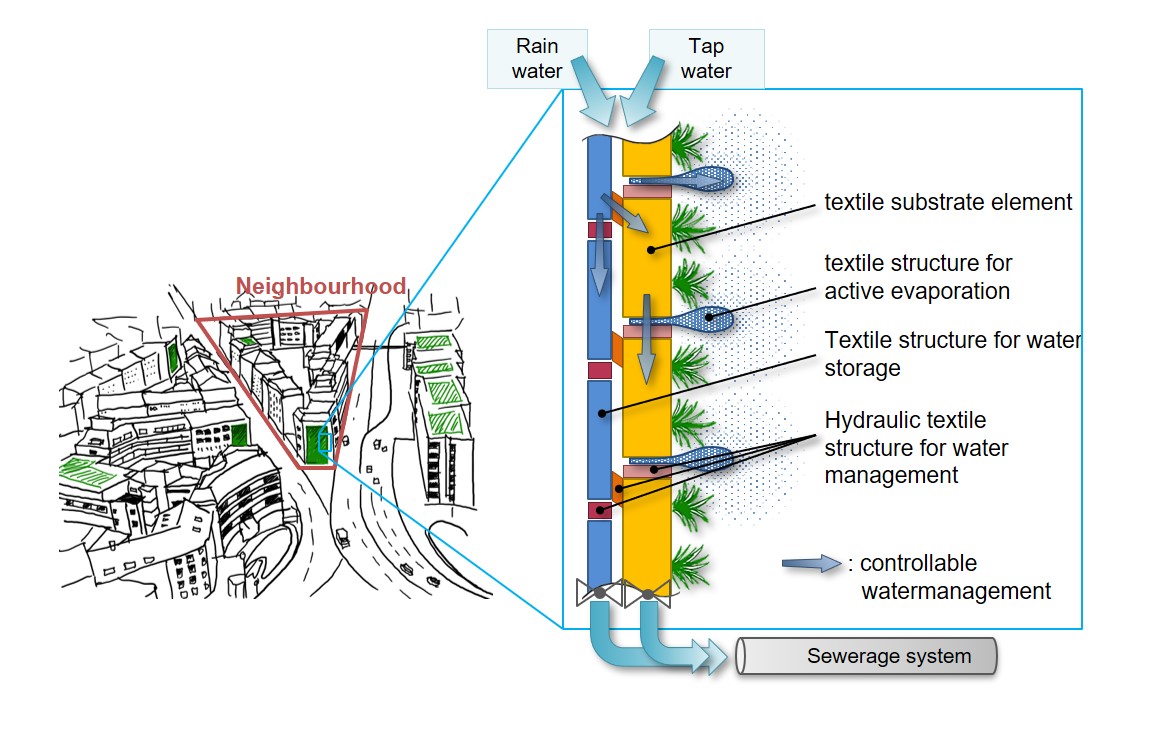 Climate change is causing temperatures to rise and storms to increase. Especially in inner cities, summers are becoming a burden for people. While densification makes use of existing infrastructure and avoids urban sprawl, it increases the amount of sealed surfaces. This has a negative impact on the environment and climate. Green facades bring more green into cities. If textile storage structures are used, they can even actively contribute to flood protection. The German Institutes of Textile and Fiber Research (DITF) have developed a corresponding "Living Wall".