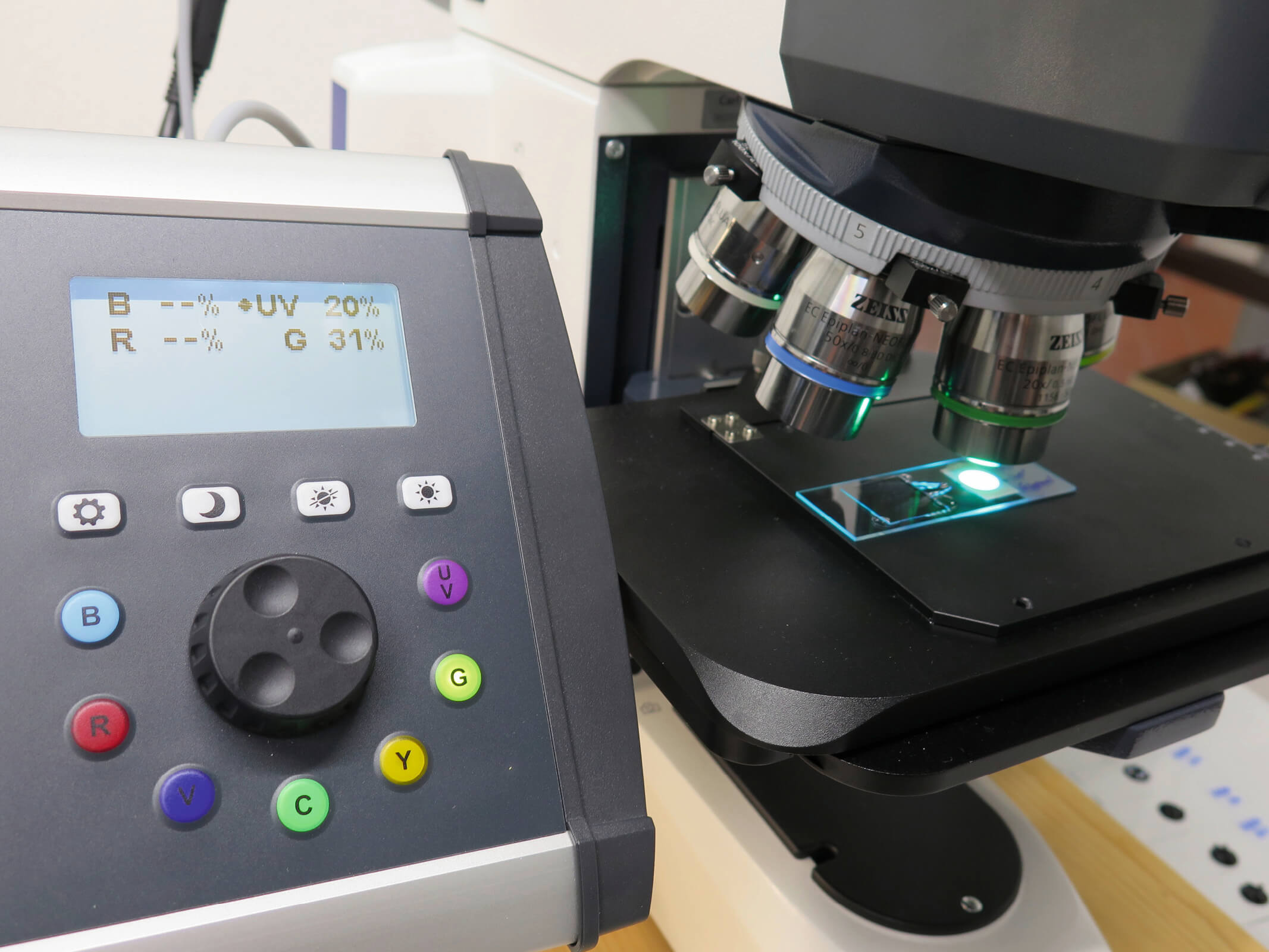 Recently, this solution has been replaced by modern LED technology. The DITF have also retrofitted an LED fluorescence device (Colibri) manufactured by Carl Zeiss. The advantages are immense: exactly the right wavelength for excitation of the fluorescent dye can be selected from the outset. In addition, the brightness of the excitation can be regulated. It is even possible to mix different color channels and thus enable optimal imaging of the sample. For, pure UV excitation can be mixed with light from the visible range. For example the green fibers, the Carl Zeiss Colibri device on a new Axioscope 5 reflected light microscope has proven to be ideal. Under UV excitation, the distribution of the spinning preparation over the entire green fiber bundle can be easily visualized. This allowed any inhomogeneities to be made visible and the preparation distribution to be optimized.